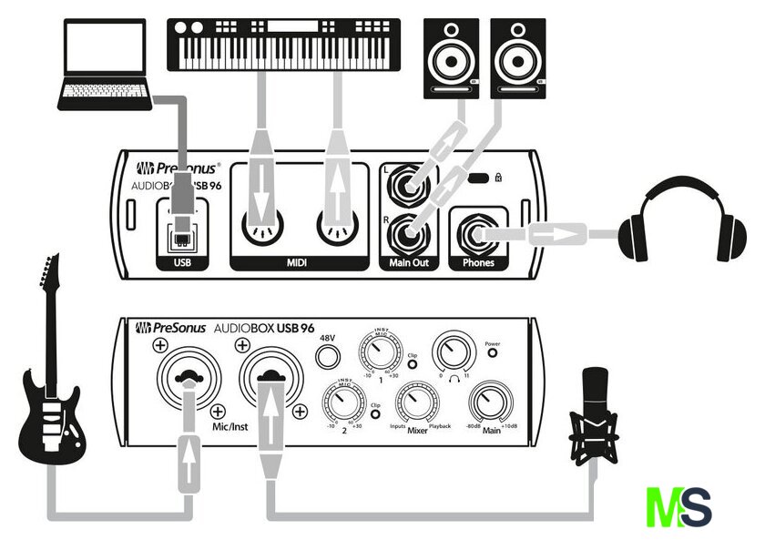 | Комплект поставки | AudioBox USB96Кабель USB длиной 1.8 мИнструкция команд к программе Studio One Key Commands GuideИнструкция по безопасности PreSonus Health Safety and Compliance Guide |