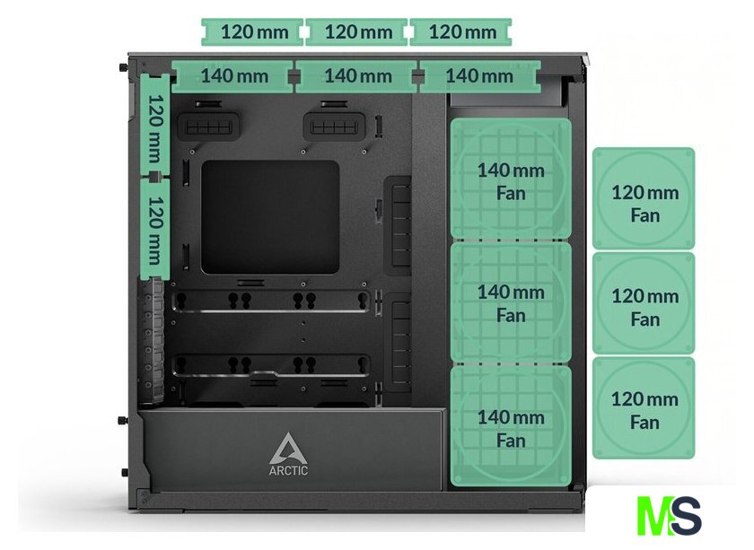 | Расположение вентиляторов | сверху:3x120 мм или 3x140 ммсбоку:3x120 мм или 3x140 ммсзади:2x120 ммустановленысбоку:3x140 ммсзади:2x120 мм |
