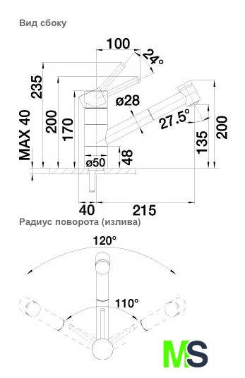 | Поворотный излив | 120 ° |