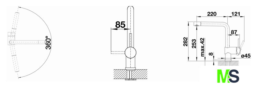 | Поворотный излив | 360 ° |