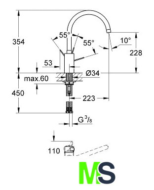 | Длина (вылет) излива | 223 мм |