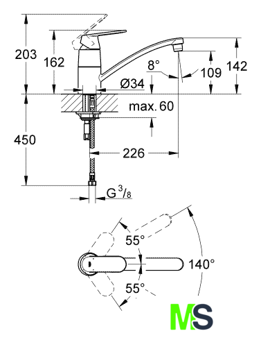 | Длина (вылет) излива | 226 мм |