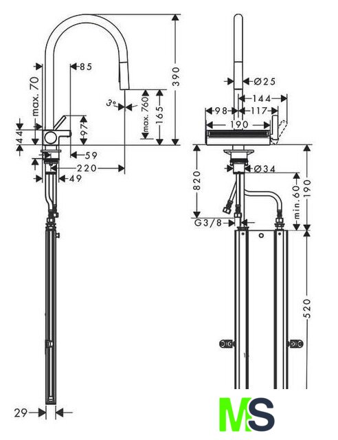 | Поворотный излив | 60 ° (или 110° или 150°) |