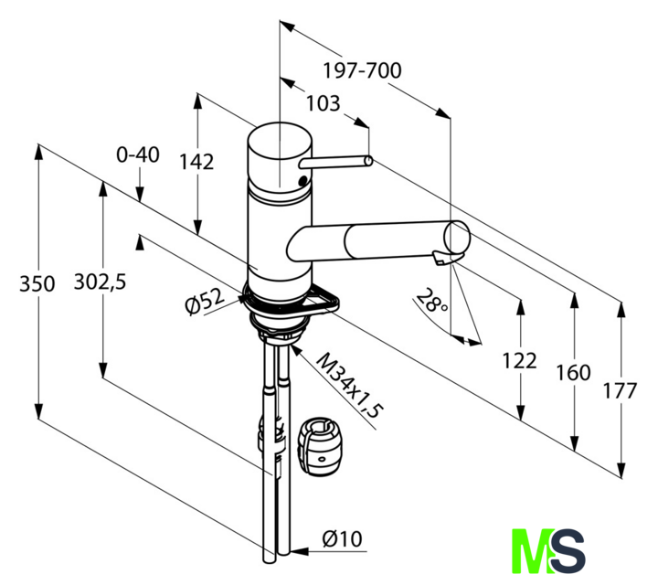 | Длина (вылет) излива | 197 — 700 мм |