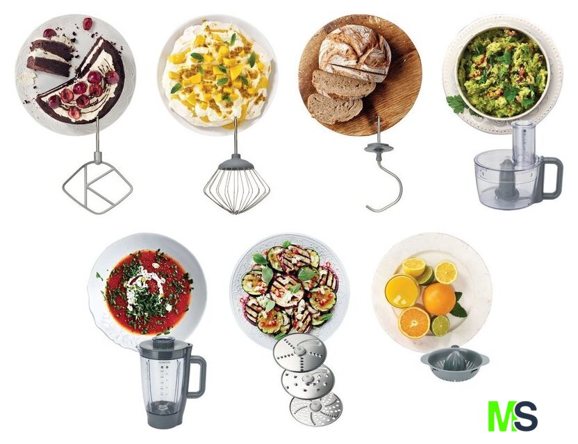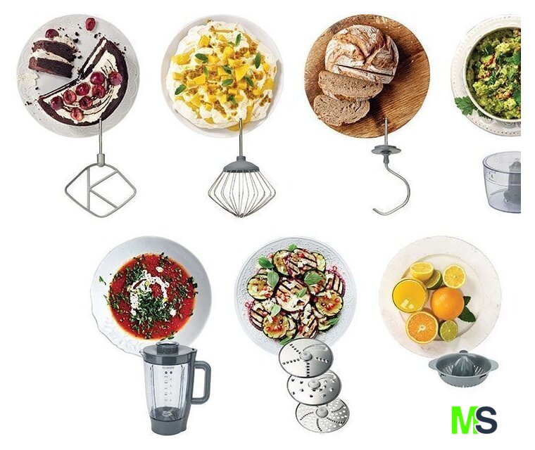 | Функции | блендер, цитрус-пресс, взбивание, смешивание, замешивание дрожжевого теста, измельчитель, рубка, терка, шинковка, ломтерезка, драники |