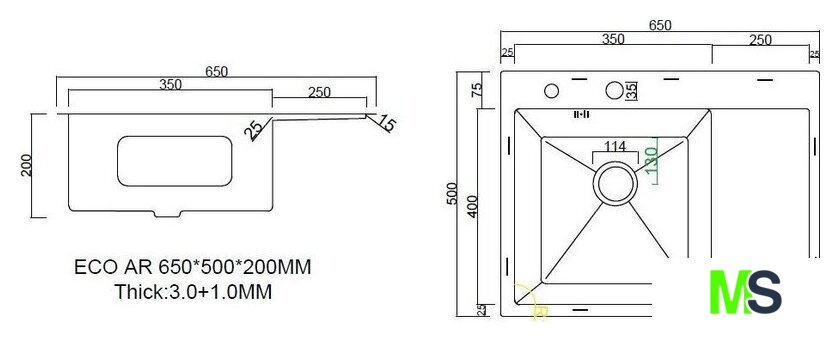 врезная на столешницу, нержавеющая сталь, размеры: 65x50 см