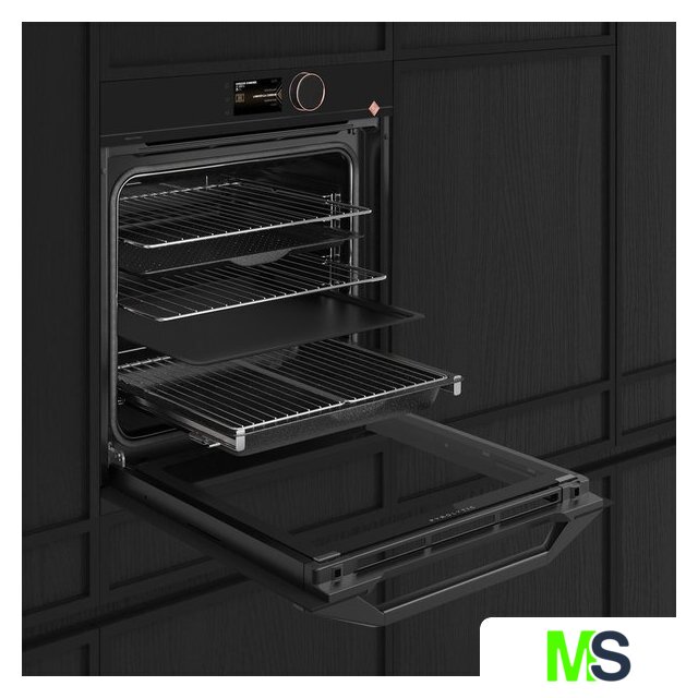электрический с конвекцией, объем 73 л, 12 режимов, автопрограммы, очистка пиролитическая, 4 стекла в дверце, направляющие проволочные + телескопические