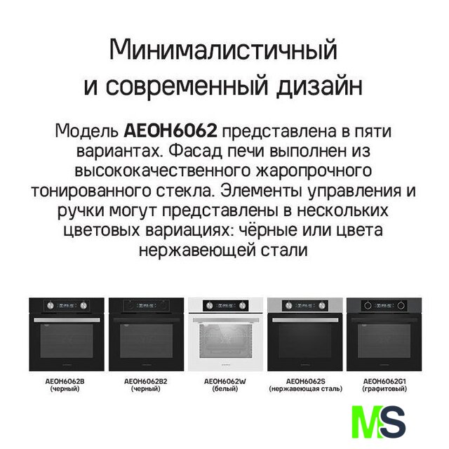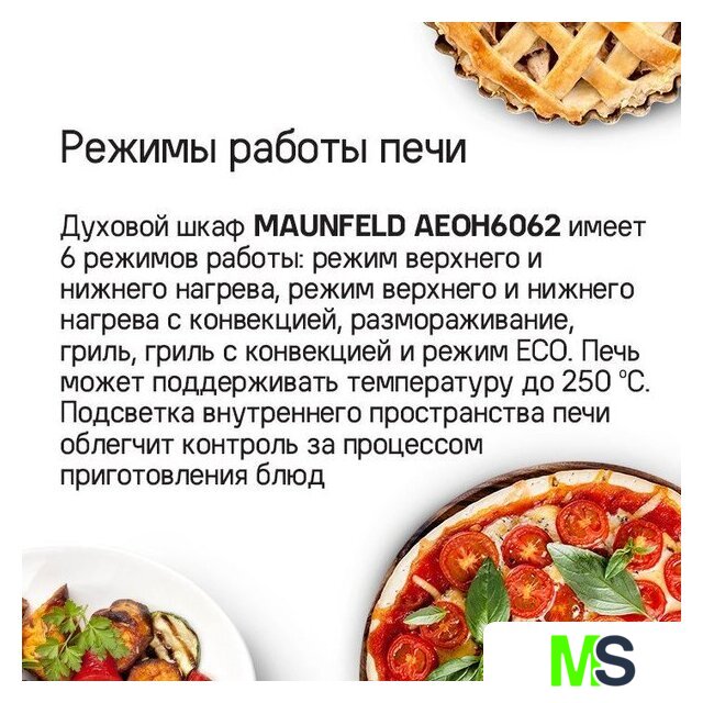 | Режимы работы | двухсторонний нагрев, гриль + конвекция, нижний нагрев + конвекция, двухсторонний нагрев + конвекция, размораживание |