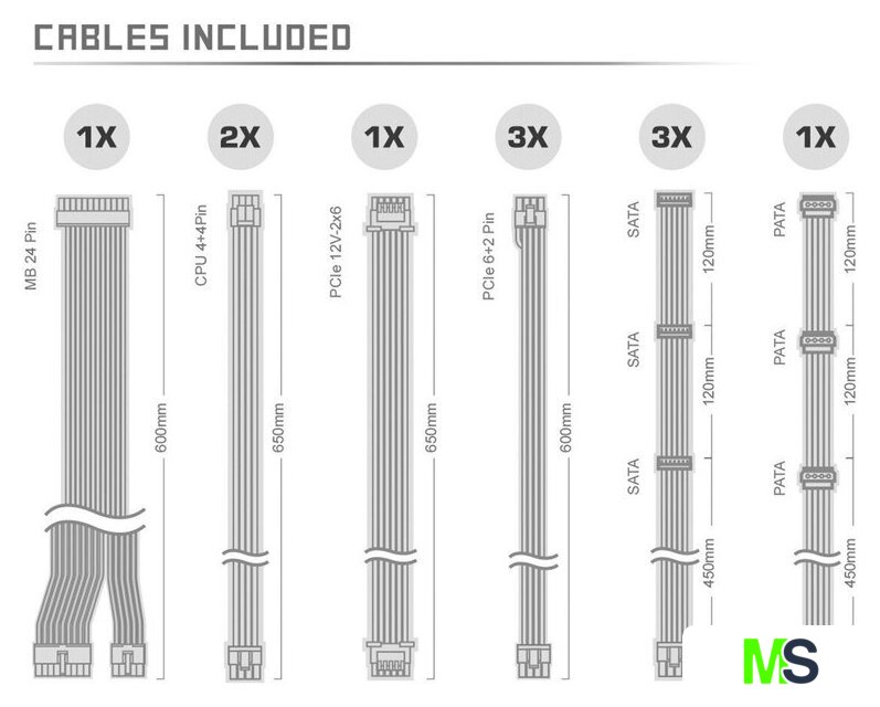 | Комплектация | - кабель питания материнской платы 24 pin- кабель PCIe Gen5- 2 кабеля питания процессора 4+4 pin- 3 кабеля питания видеокарты PCIe 6+2 pin- кабель питания периферии IDE 4 pin- 3 кабеля питания SATA |
