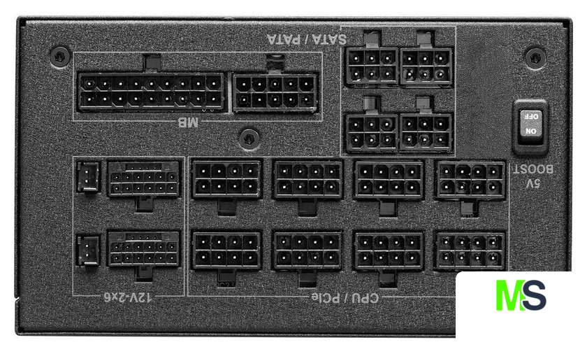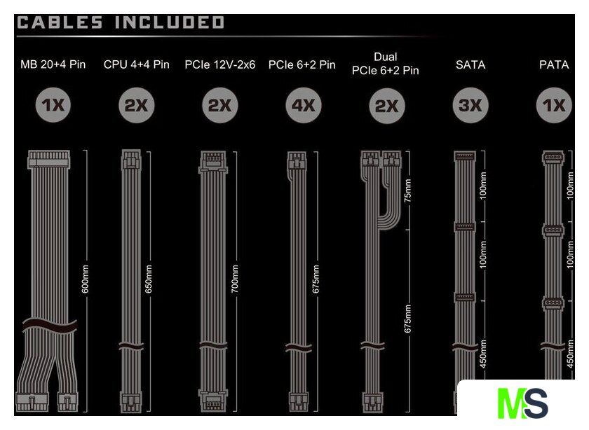 | Комплектация | - кабель питания 24 pin- 2 кабеля питания CPU 4+4 pin- 2 кабеля PCIe Gen5 (12V-2x6)- кабели PCIe 6+2 pin (8 коннекторов)- кабели SATA (9 коннекторов)- кабели IDE 4 pin (3 коннектора) |