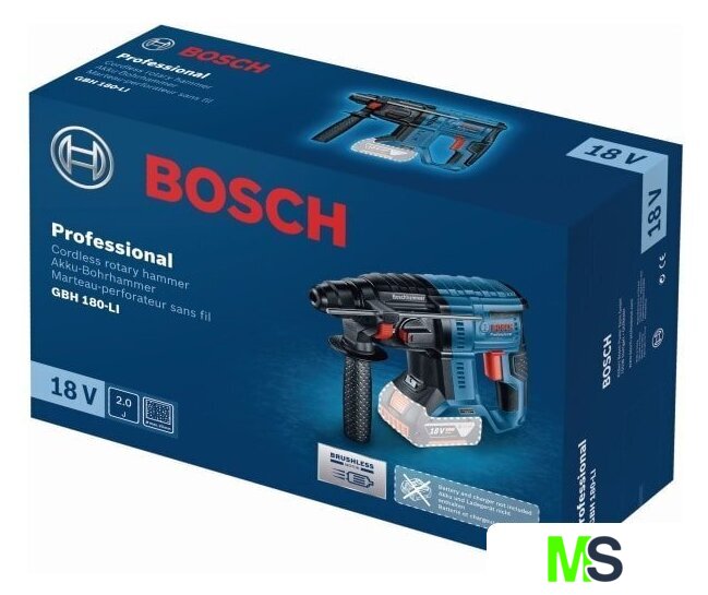 | Комплект поставки | - Перфоратор GBH 180-LI Professional- Дополнительная рукоятка 1 602 025 08X- Салфетка (№ запасной части 1 619 200 413);- Ограничитель глубины 1 613 001 003%- Коробка |