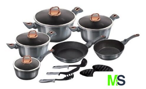 | Состав набора | Сковорода 28x5.2 смГлубокая сковорода 24x6.5 смКастрюля с крышкой 2,5 л - 20х10смКастрюля с крышкой 4,1л - 24х12.смКастрюля с крышкой 6,1л - 28x12.5 смКовш с крышкой 16х8.5 смБакелитовые подставки 2штКухонные принадлежности 3 шт |