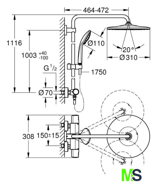 | Вылет верхнего душа | 472 мм |