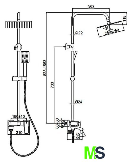 | Диаметр (ширина) верхнего душа | 250 мм |