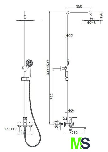 | Комплектация | верхний душ, штанга, ручной душ (лейка), держатель лейки, шланг, смеситель, излив для ванны |