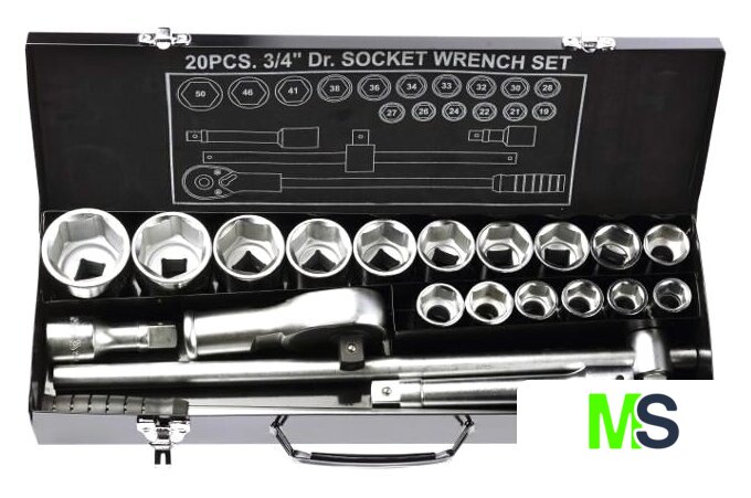 | Комплектация | - Головки 3/4": 19, 21, 22, 24 mm, L= 50 mm; 26, 27, 28 mm, L= 52 mm; 30, 32 mm, L= 53 mm; 33, 34 mm, L= 56 mm; 36 mm, L = 58 mm; 38 mm, L= 60 mm; 41 mm, L= 64 mm; 46 mm, L= 68 mm; 50mm, L= 72 mm- Трещотка 3/4", L = 500 mm- Т-образный вороток 3/4", L= 510 mm- Удлинители 3/4", L= 100 mm, 200 mm |