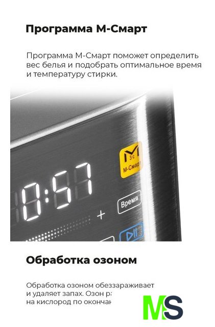 | Оригинальные функции | М-Смарт - поможет определить вес белья и подобрать оптимальное время и температуру стирки. |